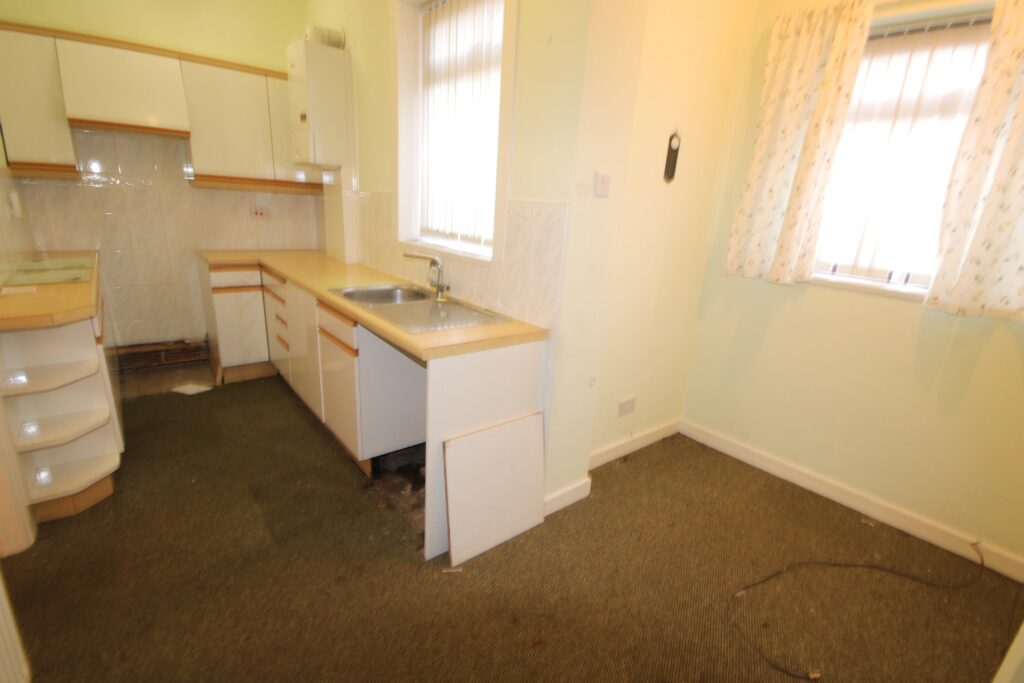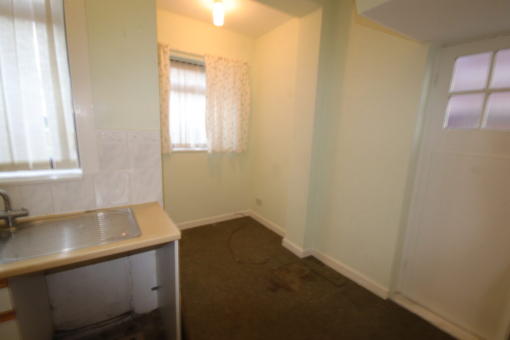 (about 15'6" x 5'9" + 5'9" x 4'6") fitted base units and wall cupboards, partly tiled walls, stainless steel sink unit with mixer tap. Worcester wall mounted gas fired central heating boiler. 2 Upvc framed double glazed windows, radiator, understairs cupboard, fluorescent lighting.