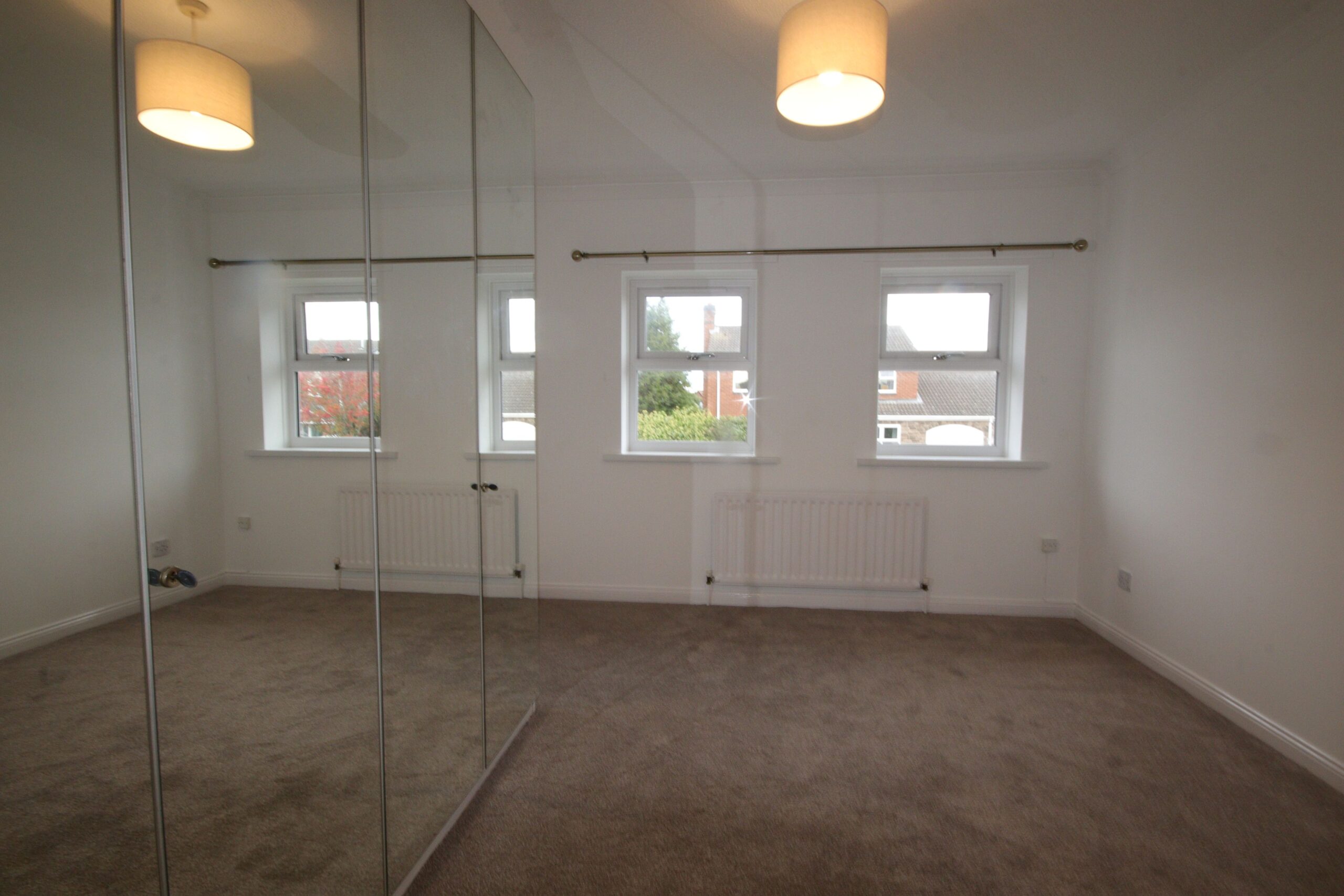 Built in ceiling to floor mirror doored wardrobes with hanging and shelving space, radiator, 2 Upvc framed double glazed windows, tv aerial and telephone points