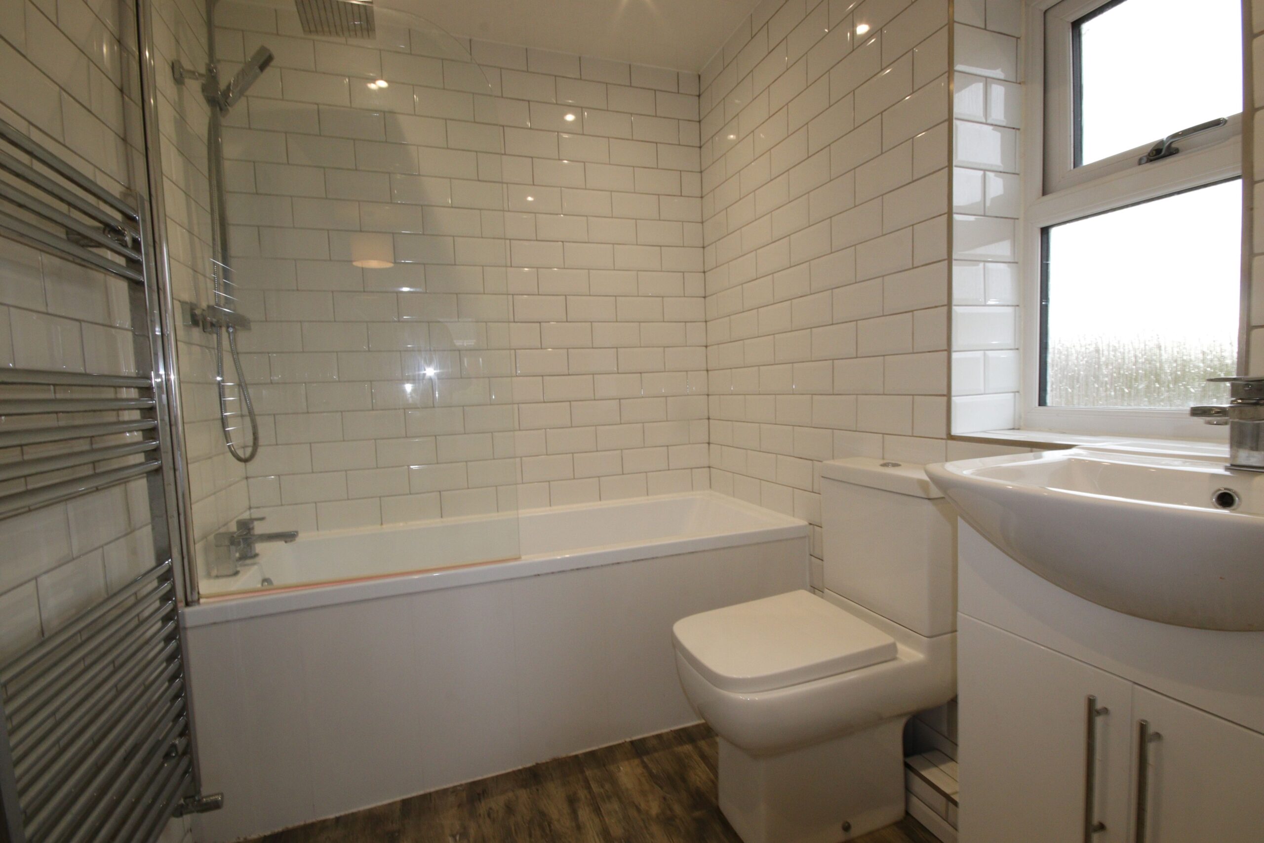 Fully tiled walls, panelled bath with shower over (hand held and rain shower), glass screen, wash basin with mixer tap and cupboard space below, chrome towel rail radiator, Upvc framed double glazed window, recessed ceiling spotlighting, panelled ceiling, extractor fan