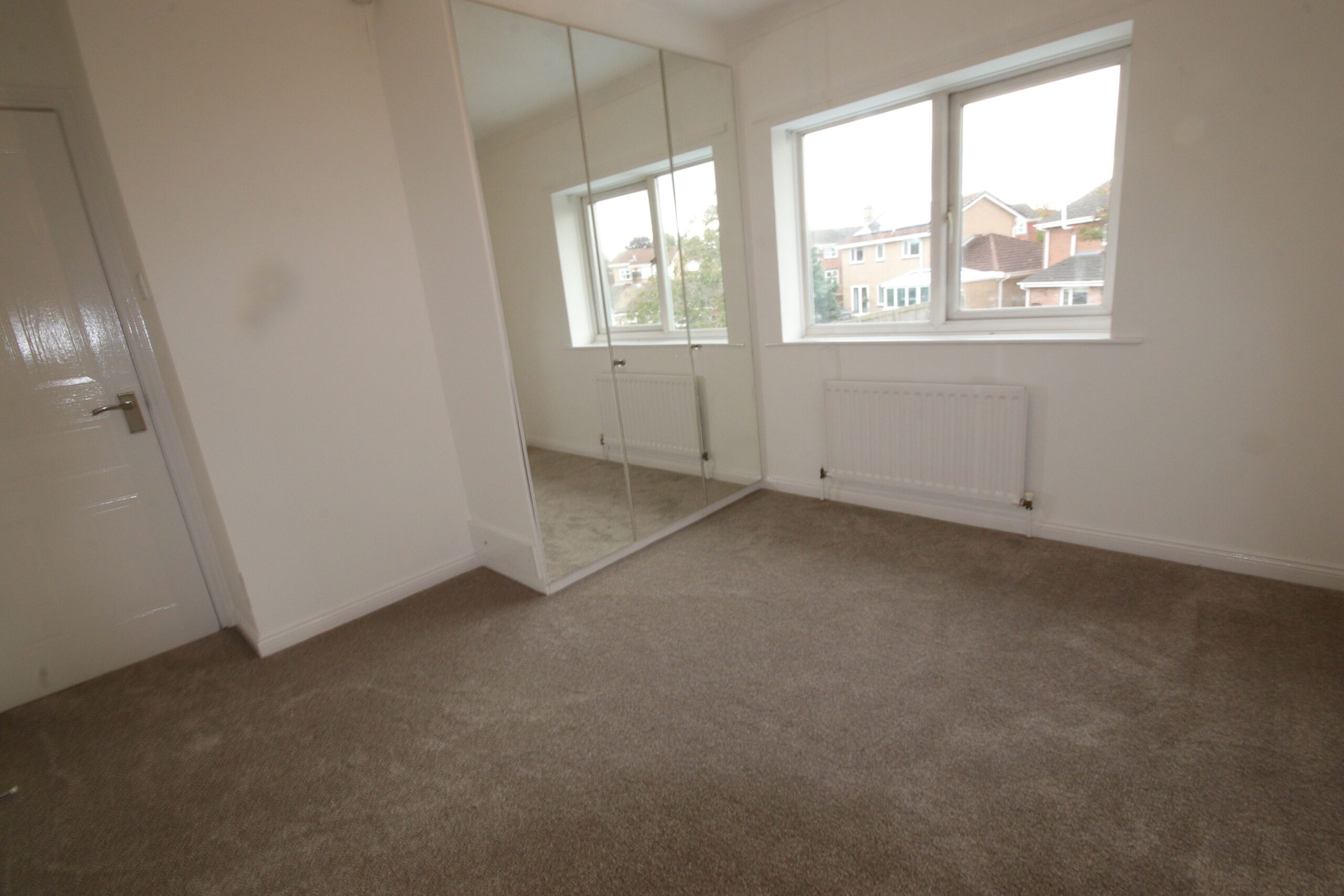 Built in ceiling to floor mirror doored wardrobes with hanging and shelving space, radiator, Upvc framed double glazed window, access to roof void