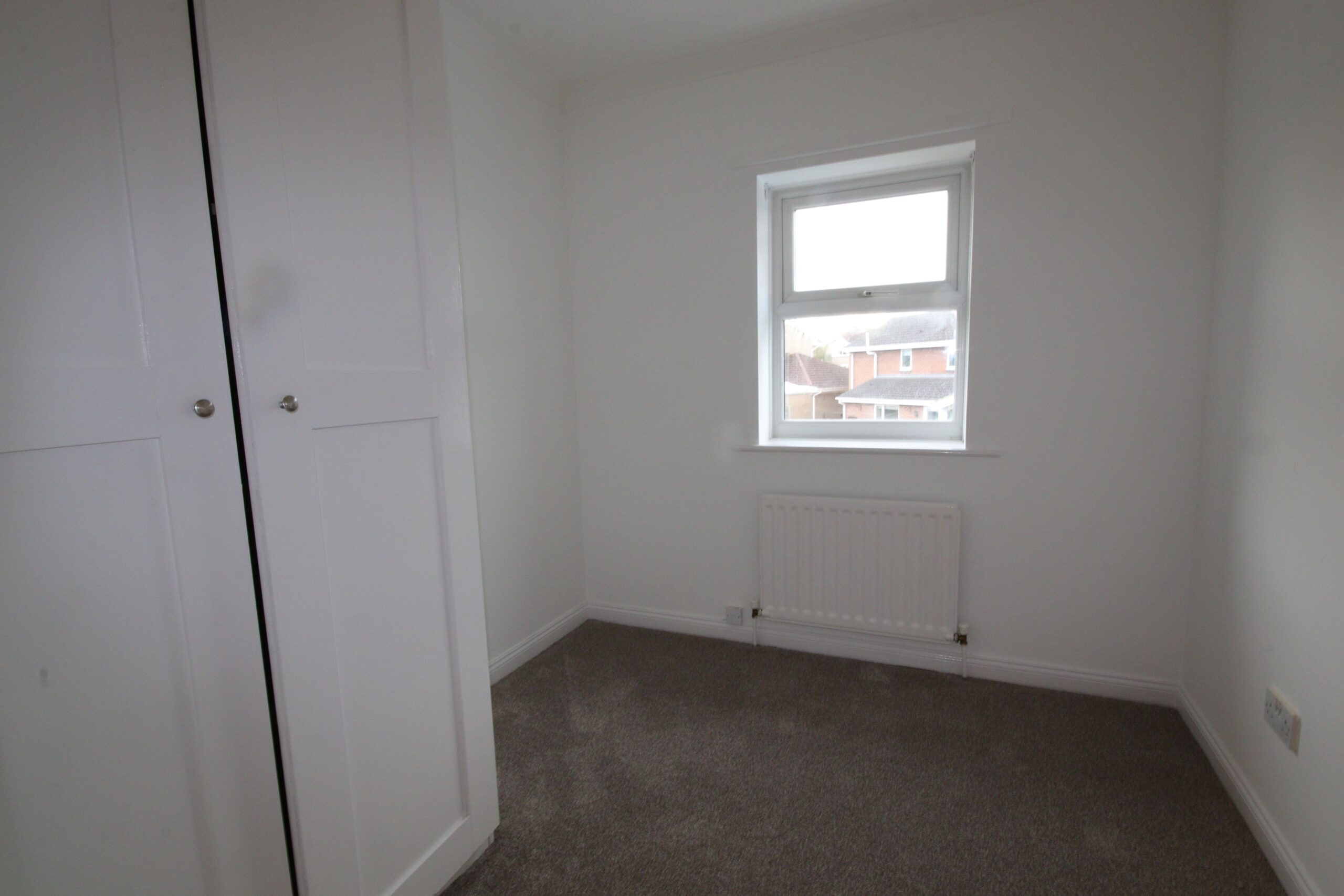 Built in ceiling to floor wardrobes with hanging and shelving space, radiator, Upvc framed double glazed window