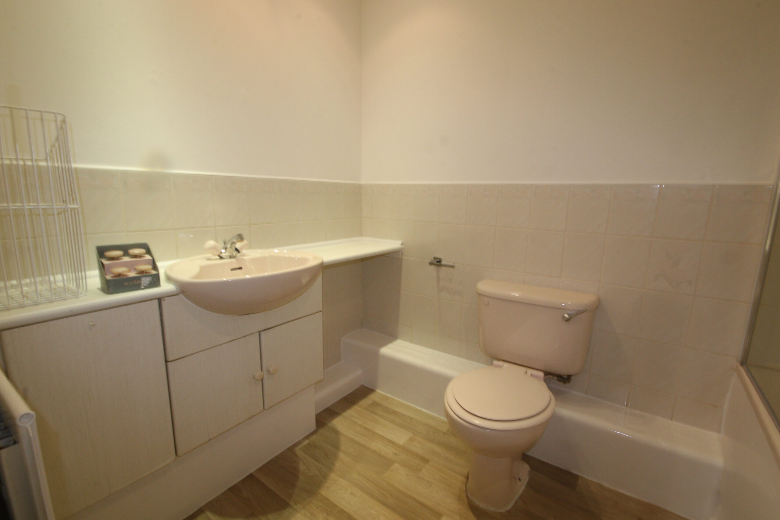 Low level wc, inset wash basin with cupboard space below, splash tiling, radiator, double glazed window