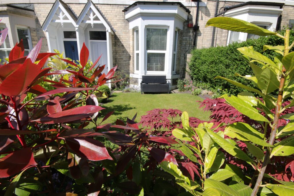 Very attractive garden to front with lawn and borders stocked with a variety of perennials, spring bulbs and flowering shrubs enclosed by iron railings and garden gate