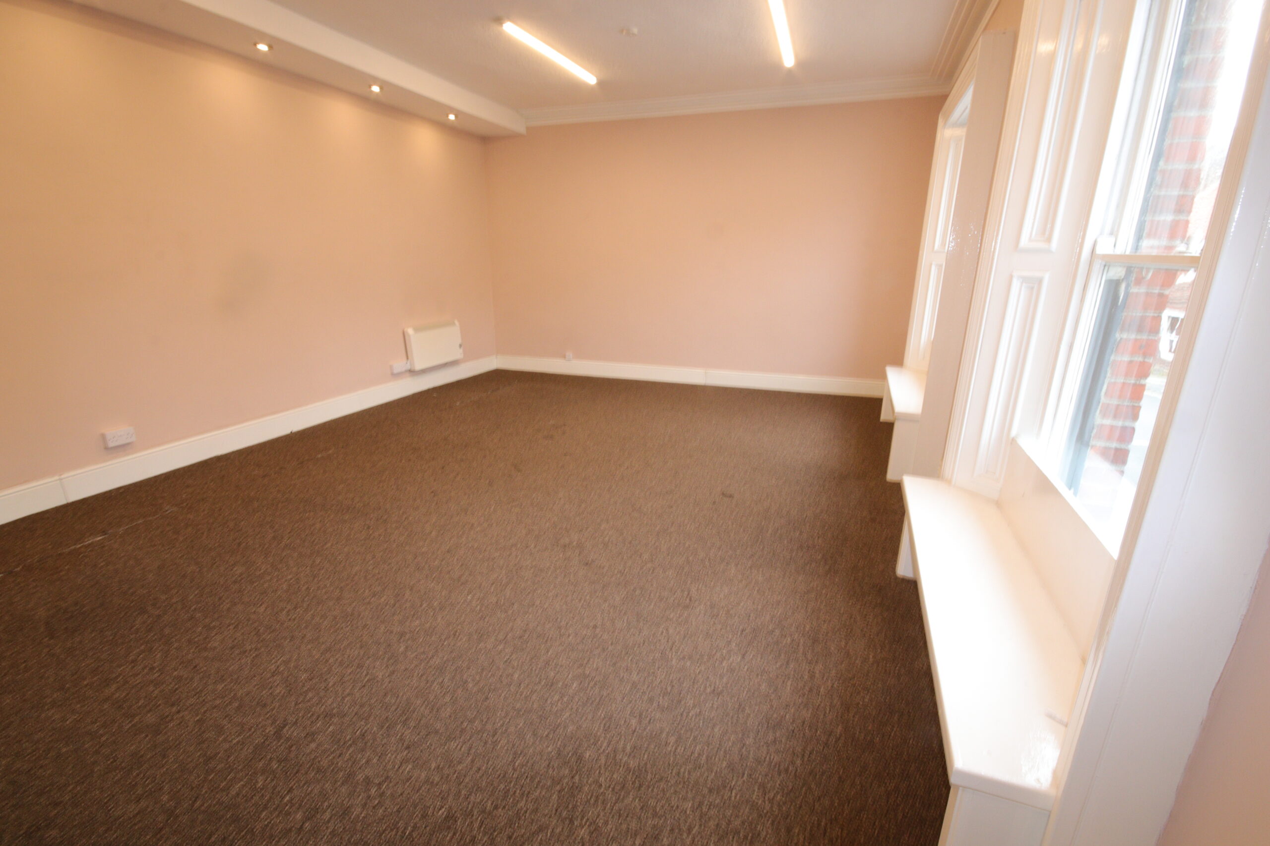 5.9m x 4.7m (about 19'3" x 15'6") wall mounted electric heaters, fluorescent and recessed ceiling light, cornice to ceiling, two fitted window seats